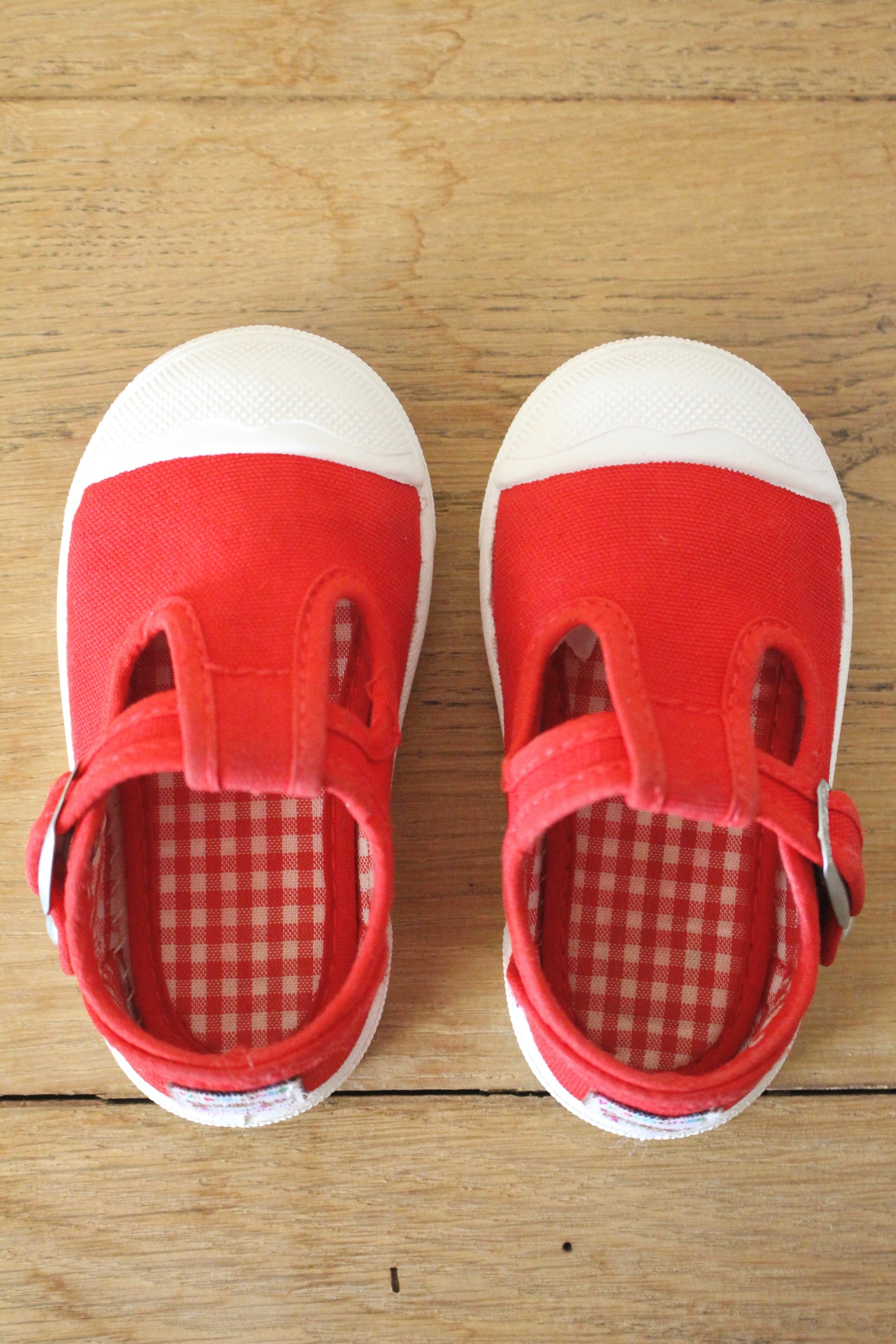 Chaussures en toile fermées, rouge, idéales pour la mi-saison. Faciles à enfiler avec son pression caché, sans lacets ni scratch !