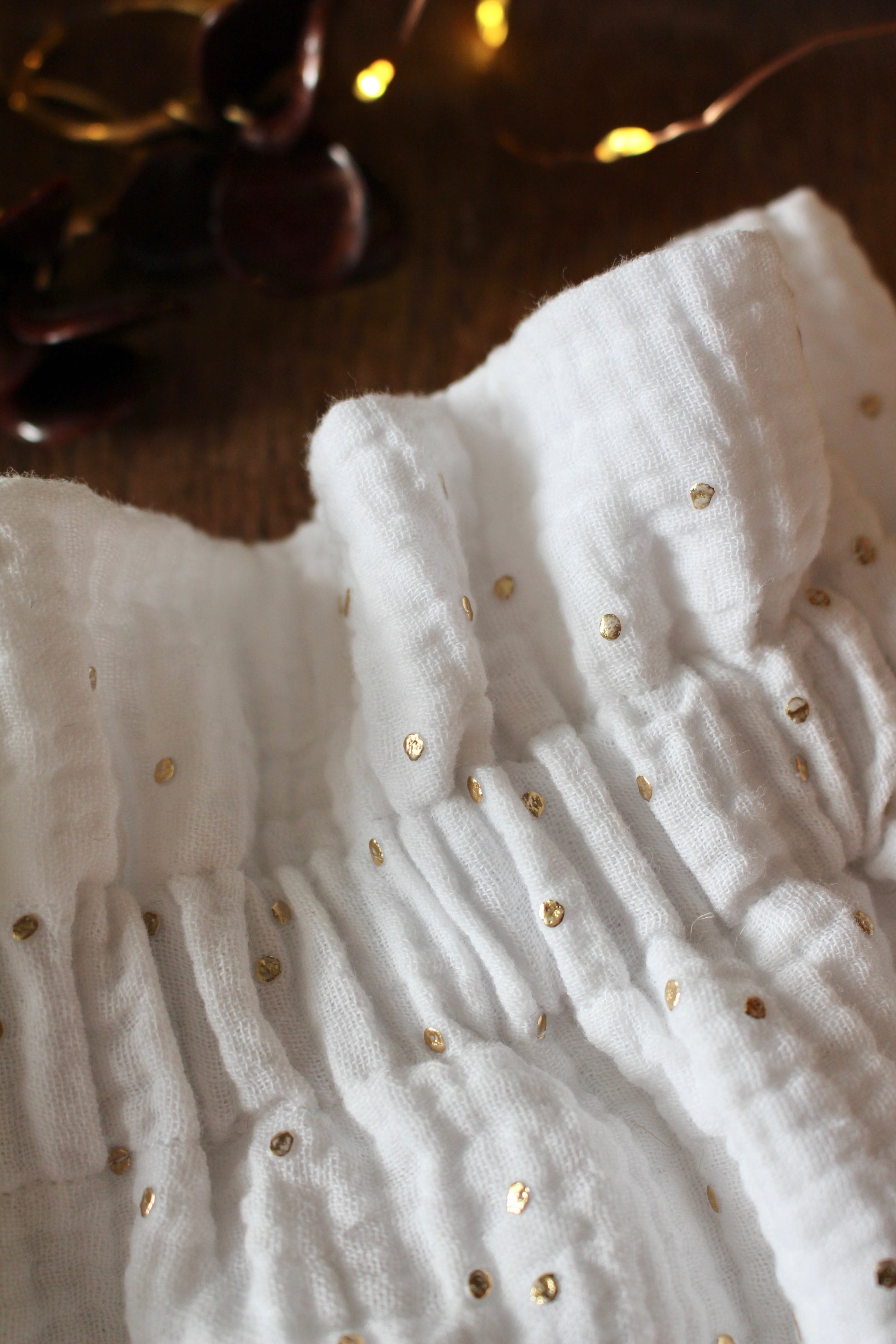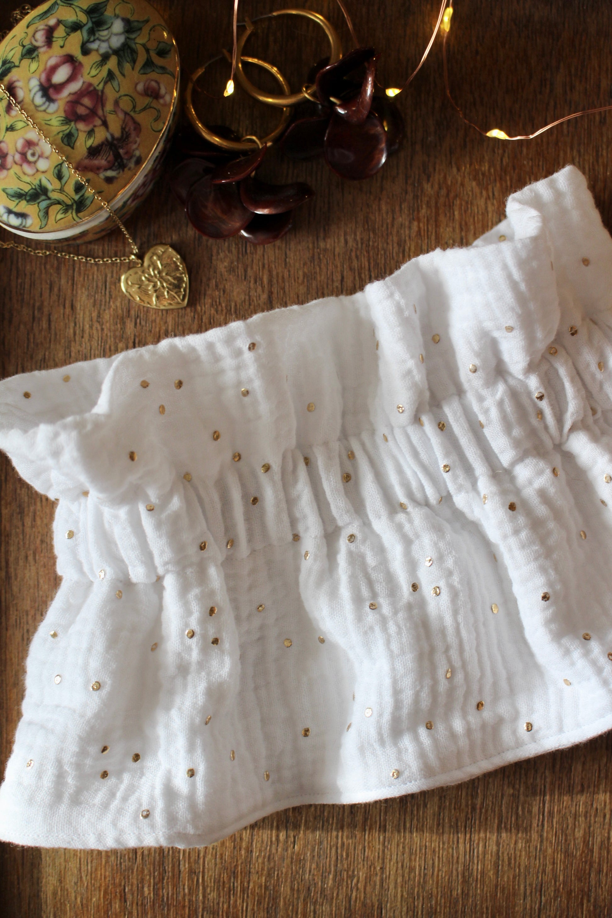 Apportez une touche de poésie à vos tenues avec ce col amovible gaze de coton et pois doré, imaginé en collaboration avec Mathilde : créatrice de L’Atelier du Temps Retrouvé et au savoir-faire délicat.