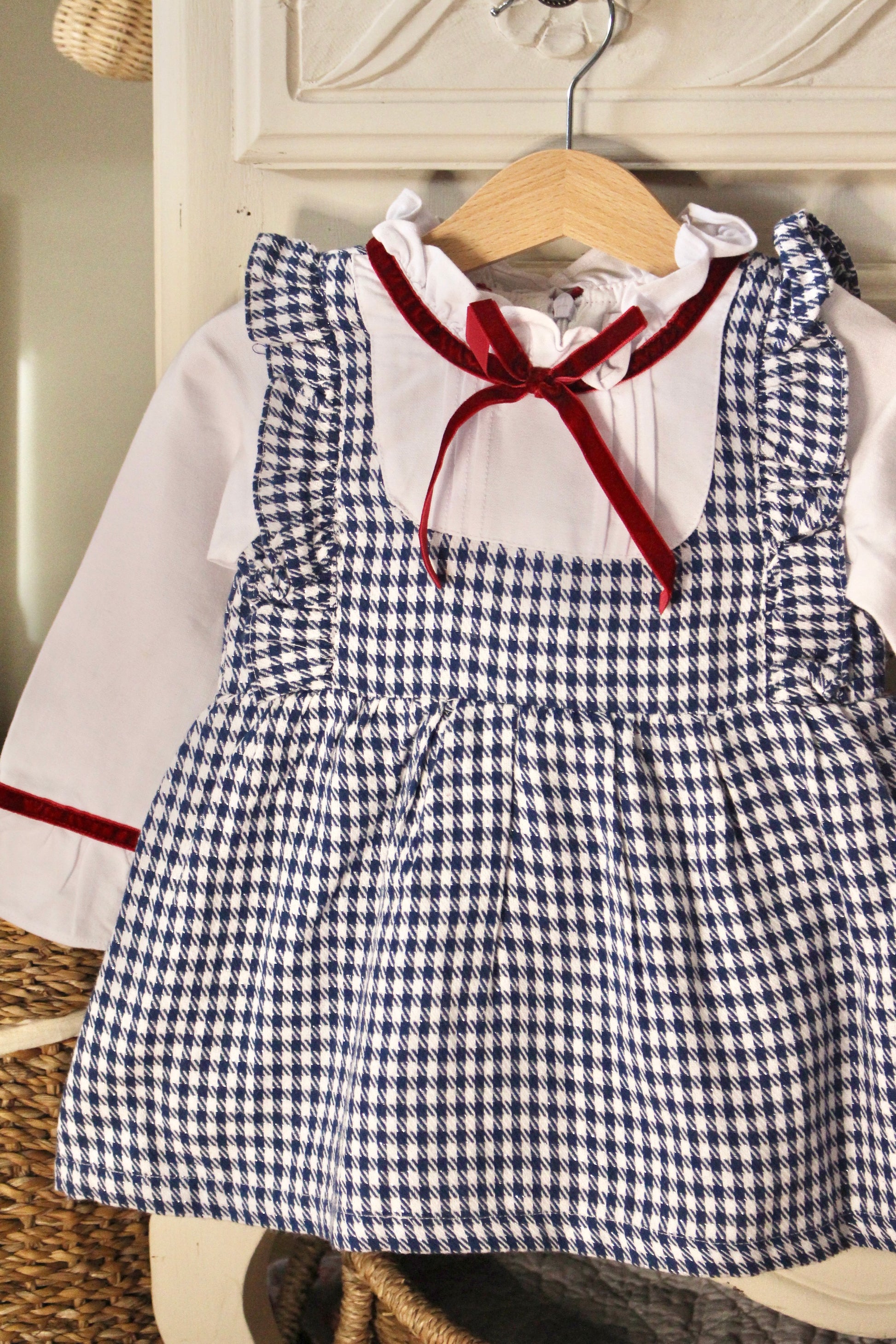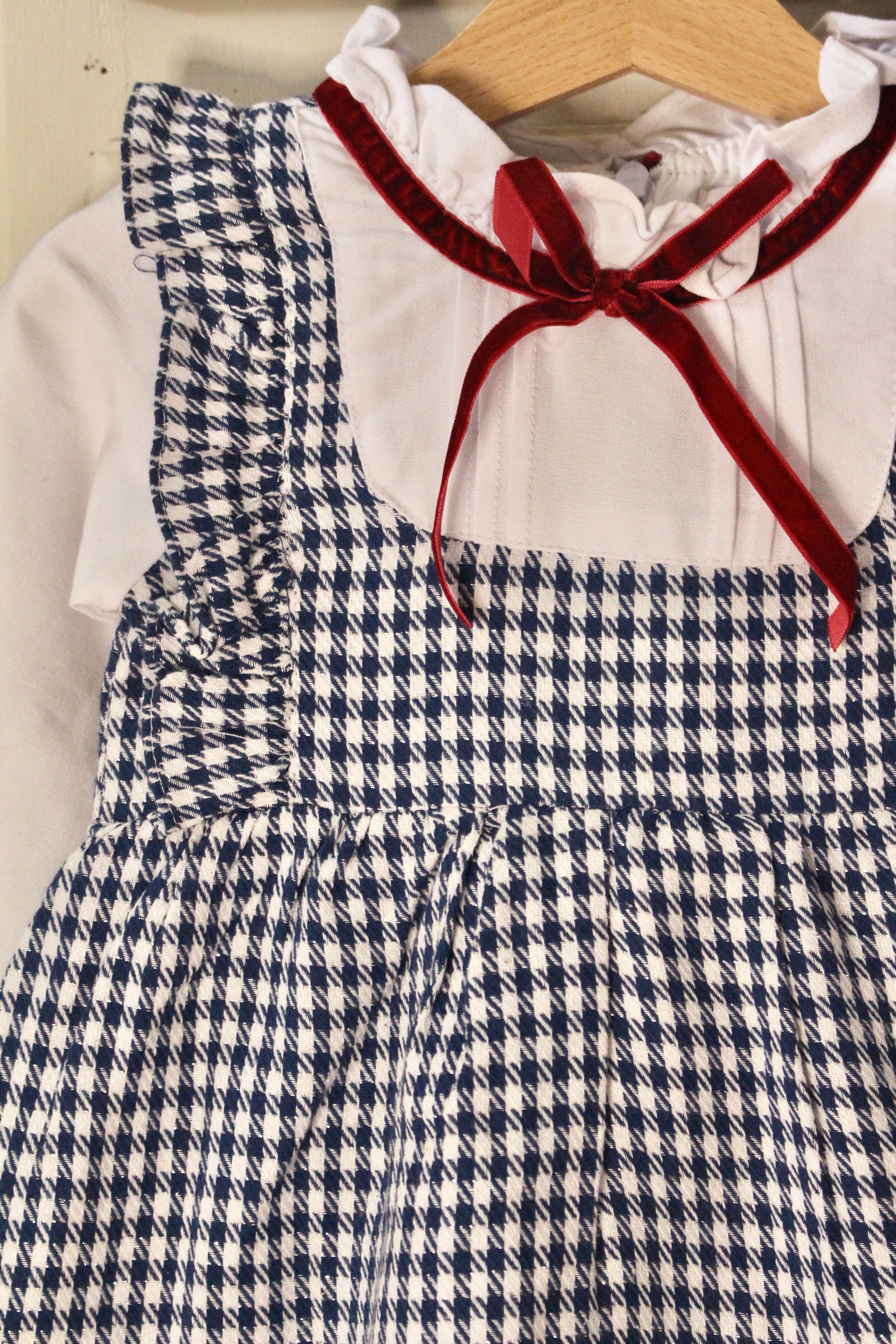 Craquez pour cette adorable robe, un modèle au charme intemporel qui associe élégance et confort. La robe se compose d’un tablier à carreaux bleu et blanc façon pied-de-poule, sublimé par de jolis volants aux bretelles. Elle est accompagnée d’une blouse blanche intégrée dotée d’un col volanté et de nœuds en velours rouge, apportant une touche raffinée et festive.