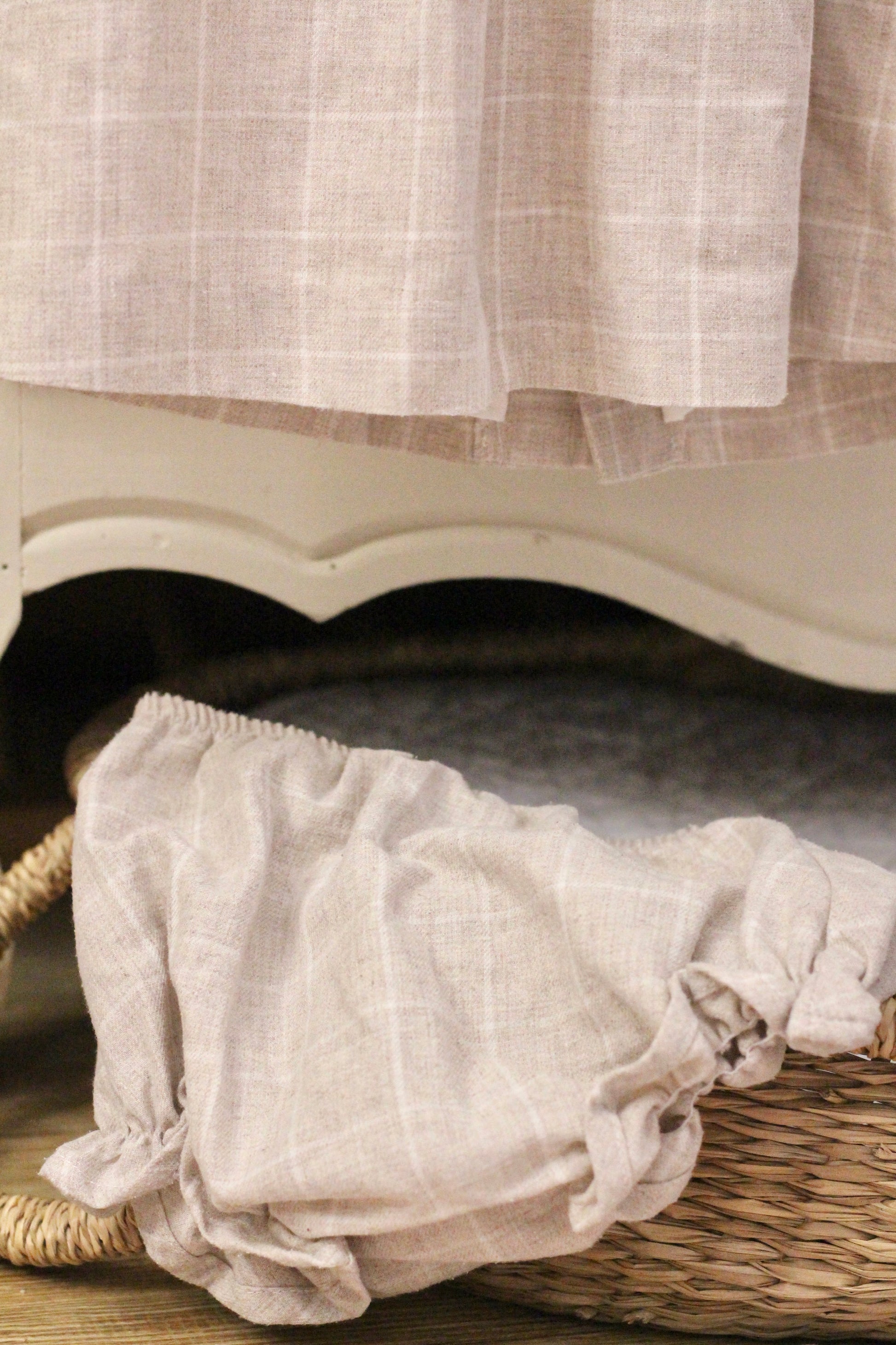L’ensemble Antonia est composé d’une ravissante robe beige à carreaux et son bloomer assorti. Joli col à volants travaillé avec sa dentelle. De belle qualité ! Idéal pour une occasion particulière (ou pas !)