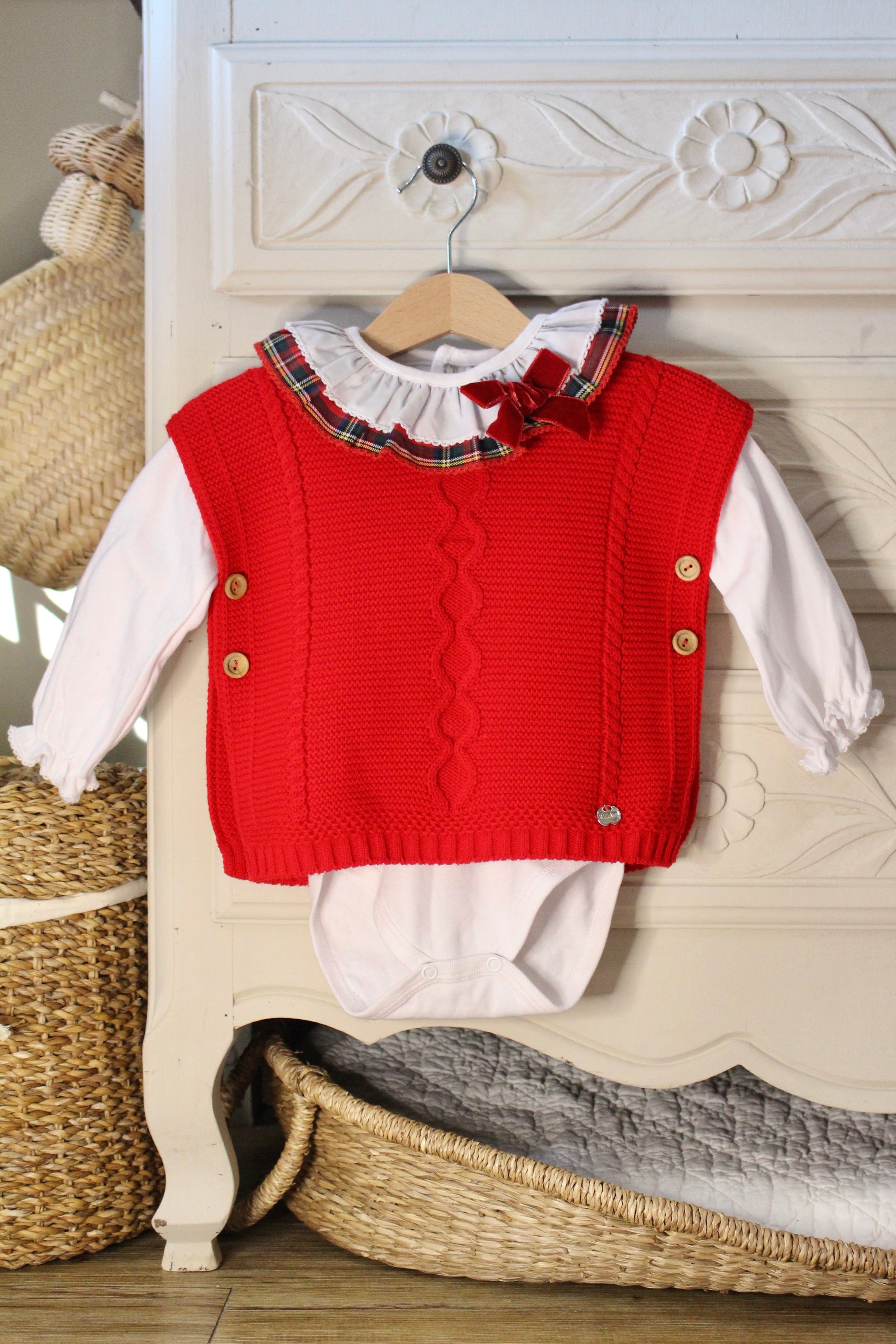 Craquez pour cet adorable ensemble de Noël composé d’un body blanc à col volanté écossais (2 ans) et d’un poncho tricoté rouge signé Juliana (18/24 mois), une marque espagnole reconnue pour ses pièces de qualité. Parfait pour les fêtes, cet ensemble seconde main allie confort, élégance et esprit traditionnel.