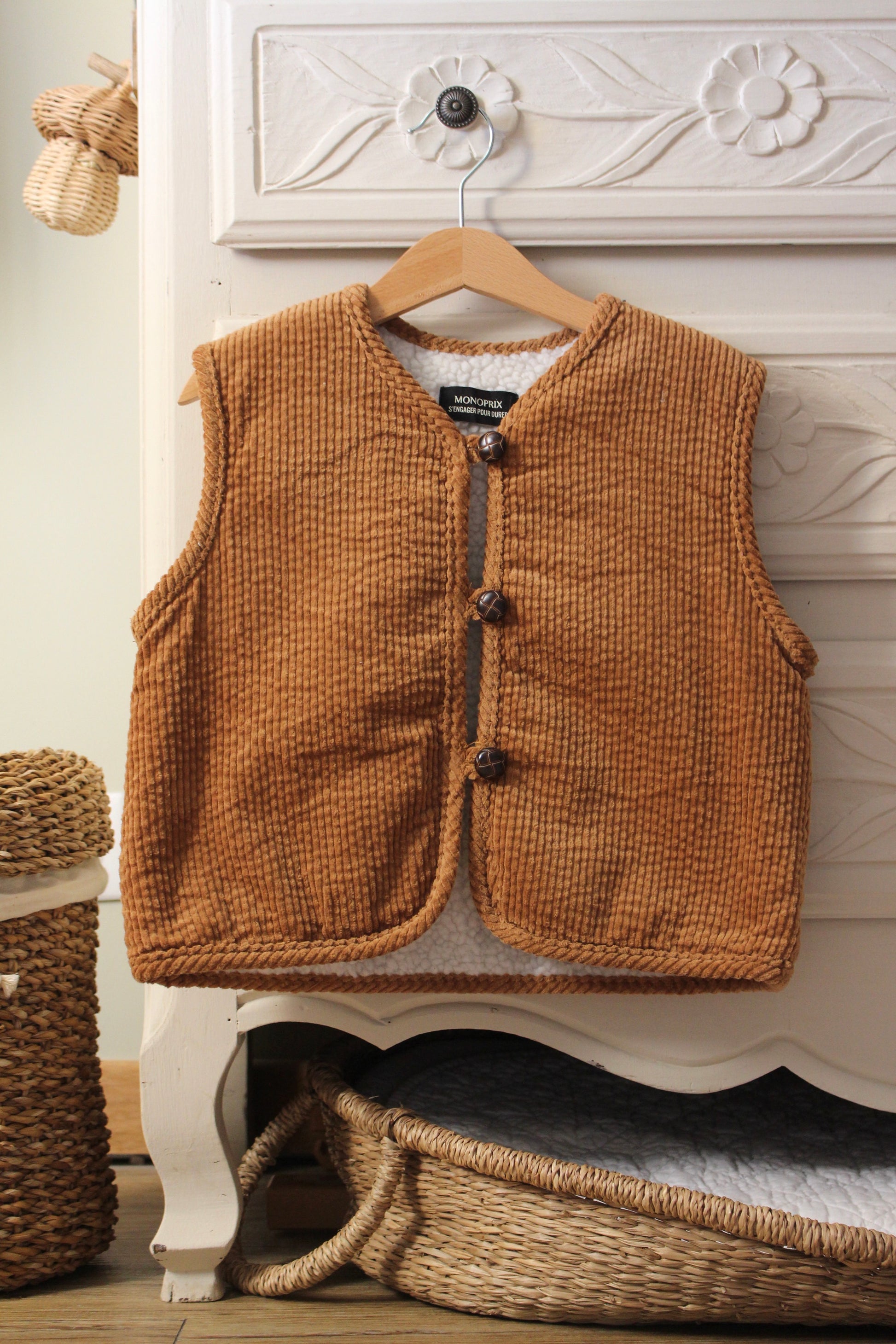 Adorable gilet sans manches en velours côtelé couleur camel signé Monoprix, parfait pour la mi-saison. Son tissu doux et texturé apporte chaleur et confort, tout en offrant un look rétro plein de charme.