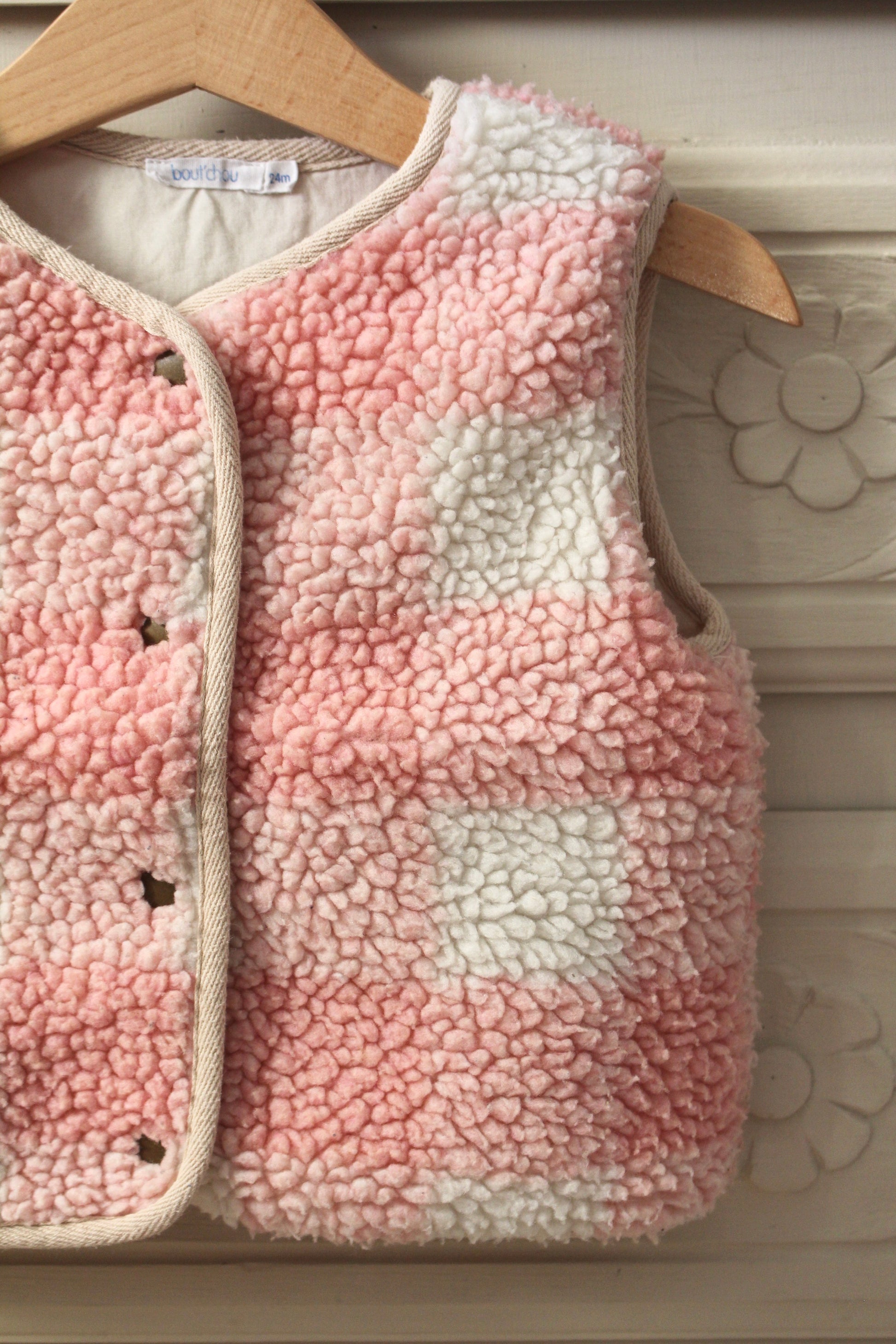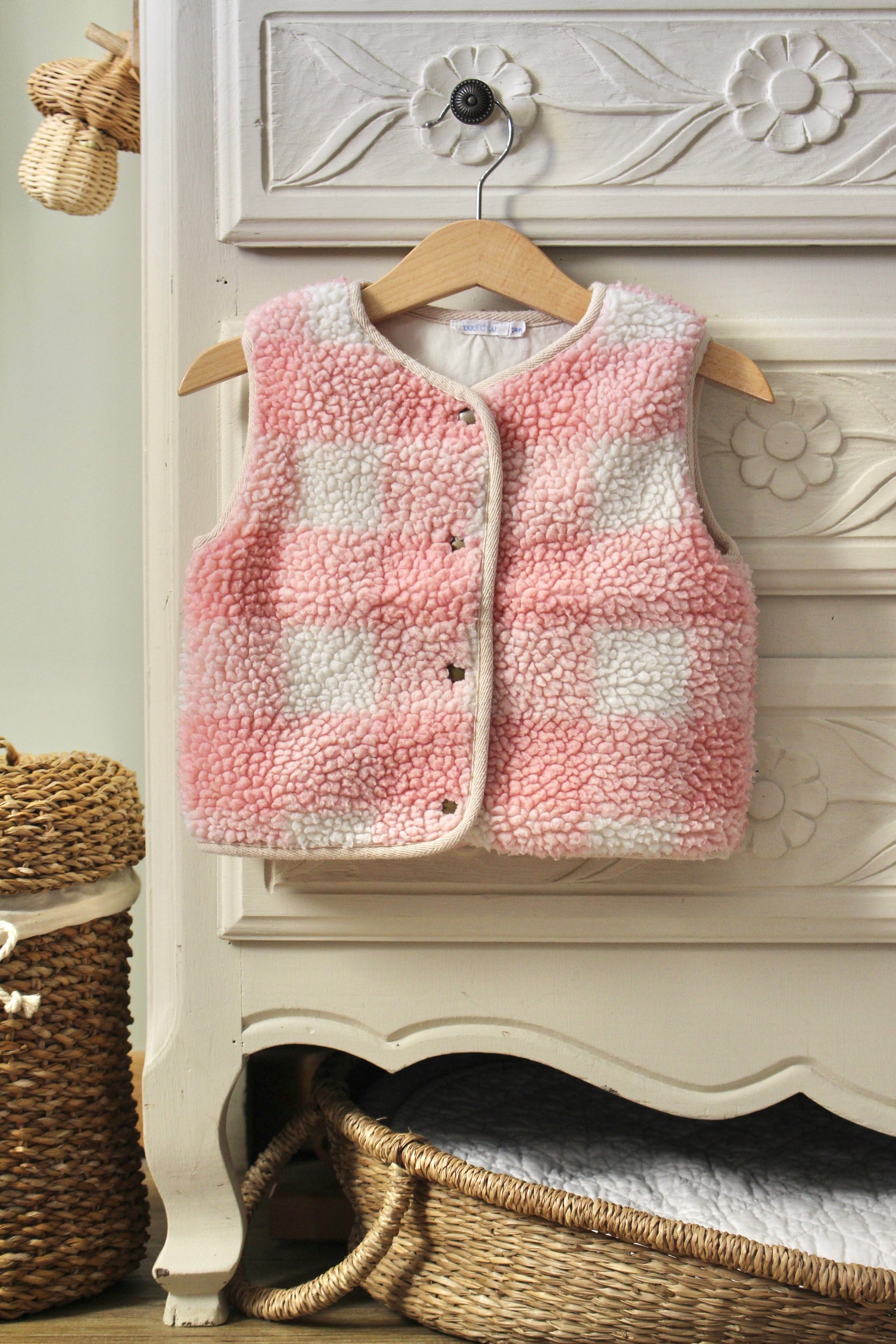 Adorable gilet vintage sans manches pour bébé, en moumoute douce et chaude. Son motif à carreaux rose et blanc apporte une touche rétro pleine de charme. Idéal pour garder bébé bien au chaud tout en restant stylée.