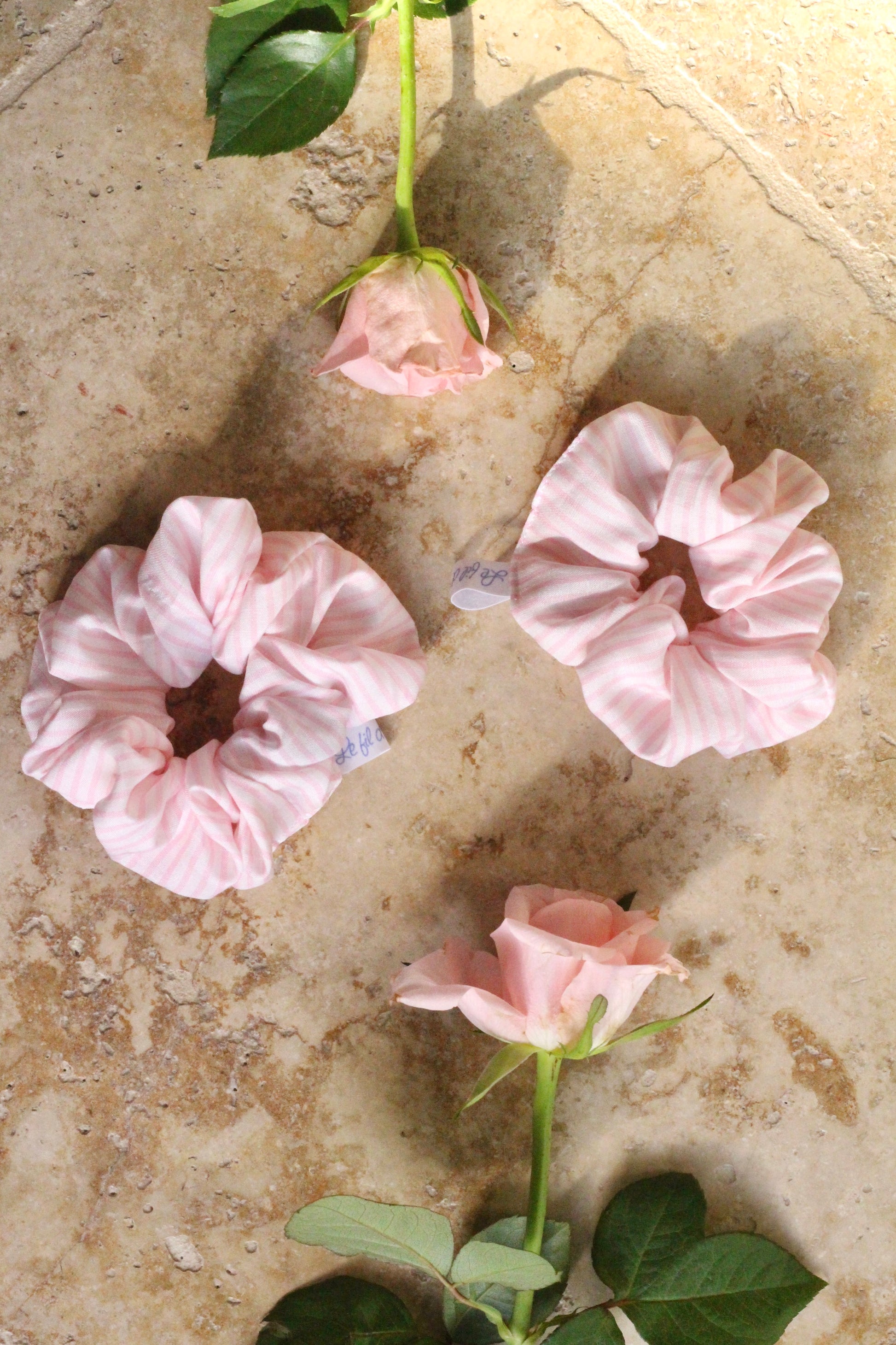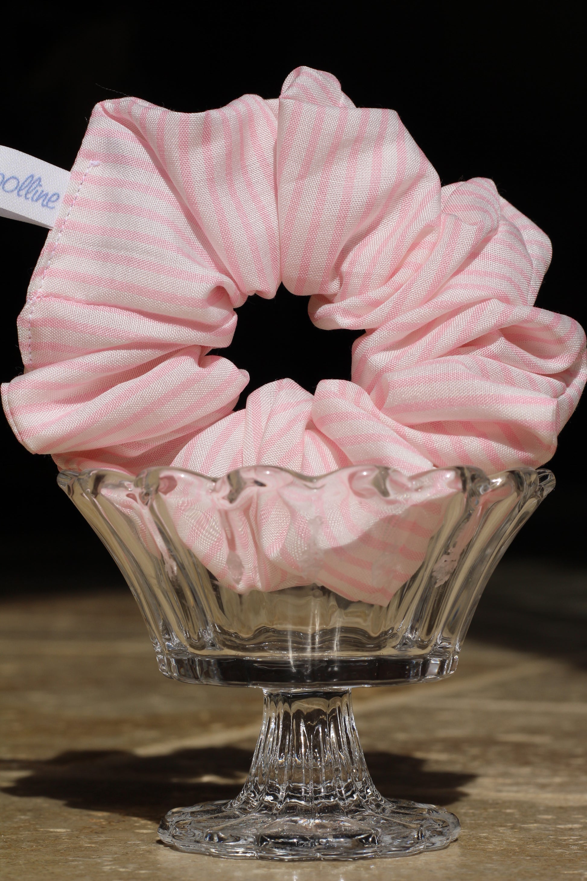Chouchou légèrement satiné à l'imprimé rayé rose pâle et blanc. Les rayures sont la tendance de cette saison et on adore !
