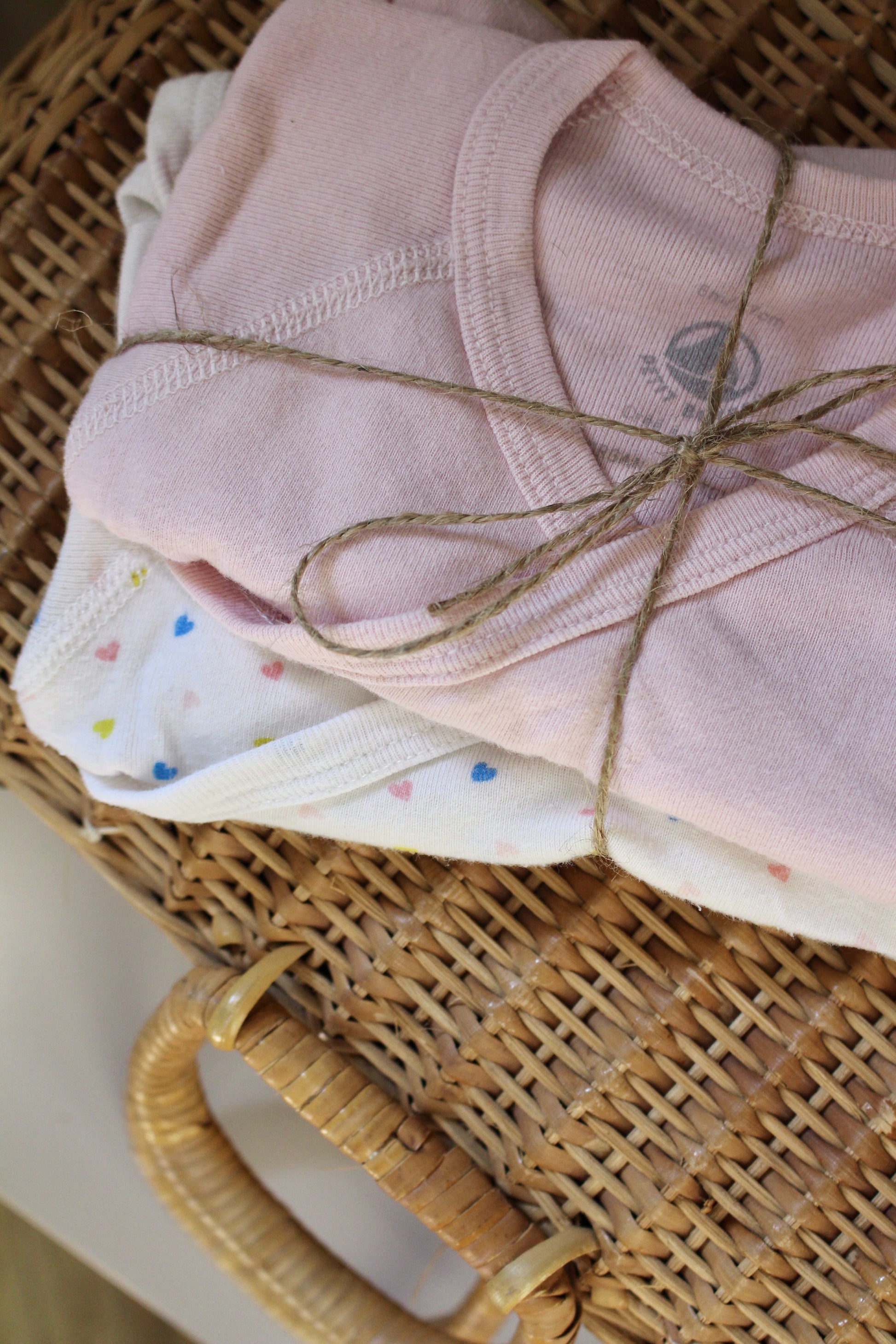 Aliénor est un joli lot de bodies manches longues, et coupe cache-coeur. L'un est uni rose clair, l'autre blanc aux coeurs multicolores. Les bodies de la marque Petit Bateau sont des intemporels à avoir au cours de la vie de bébé ! De belle qualité, ils ne bougent pas lavage après lavage. Ils sont en très bon état !