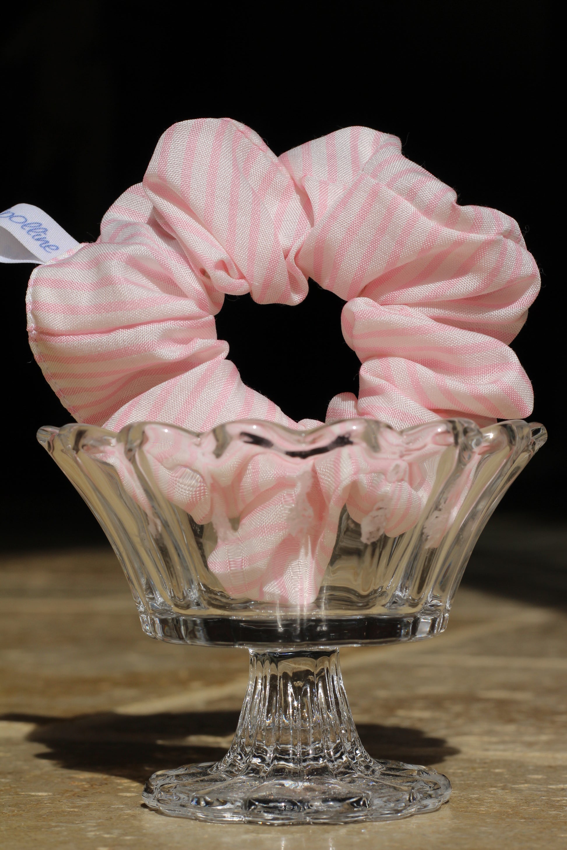 Chouchou légèrement satiné à l'imprimé rayé rose pâle et blanc. Les rayures sont la tendance de cette saison et on adore !