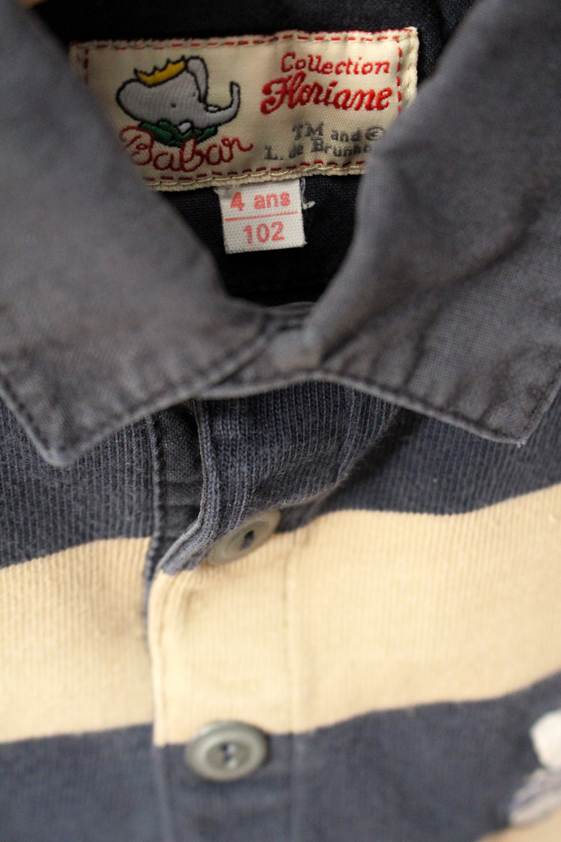 Craquez pour ce charmant polo rayé vintage à l’effigie de Babar, le célèbre éléphant qui a bercé des générations d’enfants, et qui revient sur le devant de la scène cette saison ! Avec ses jolies rayures colorées et son motif brodé Babar sur la poitrine, ce polo est une pièce pleine de tendresse et de nostalgie. Très bon état – légers signes du temps, mais aucun défaut notable. Idéal pour un look rétro plein de personnalité, tout en confort. Une pièce unique qui plaira autant aux petits qu’aux parents fans de vintage !