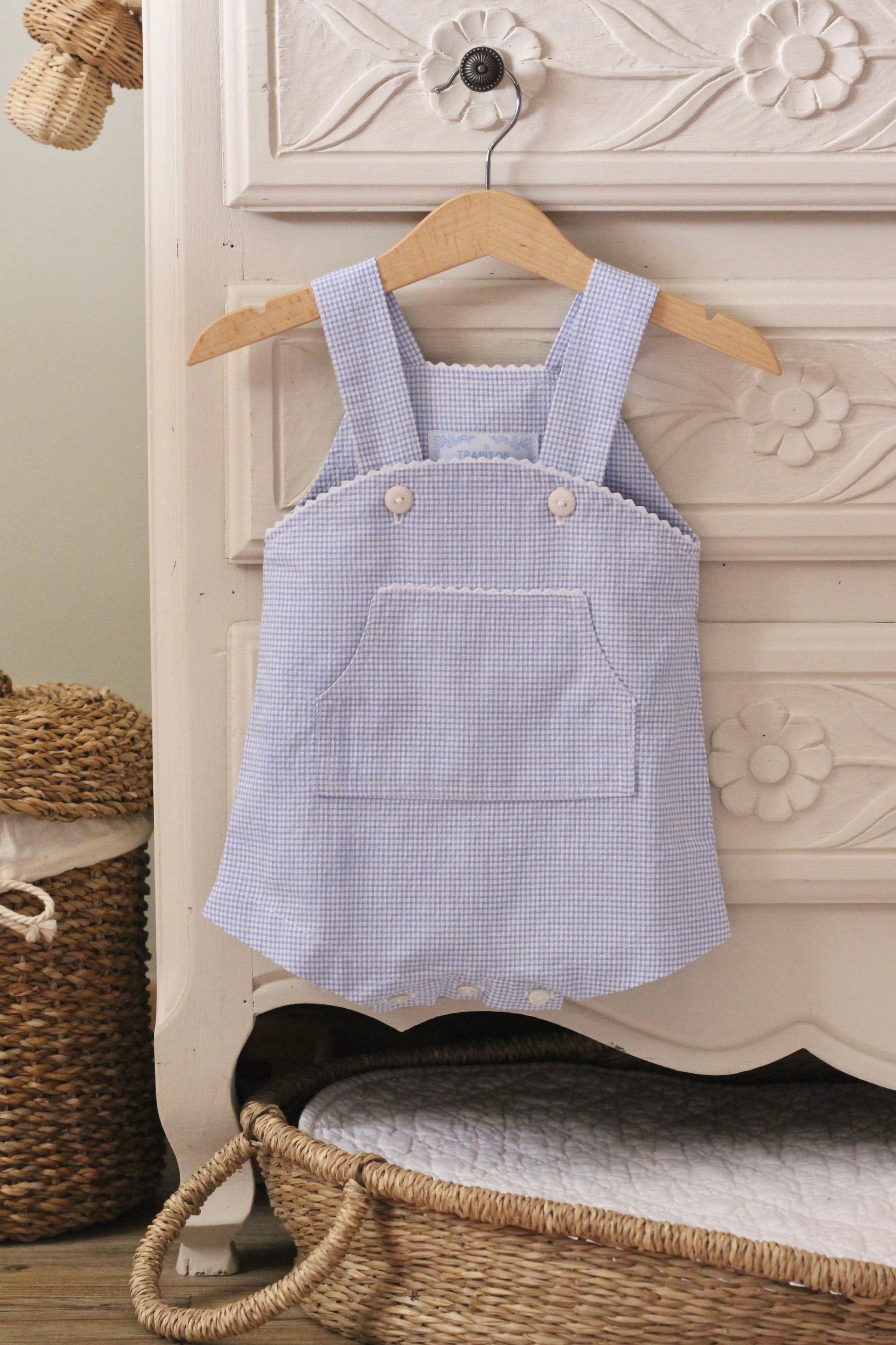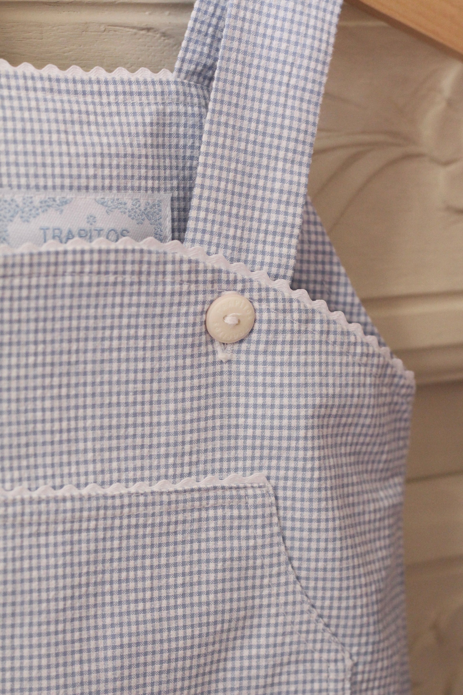 Adorable non, cette salopette Gaspard ? Beau vichy bleu bébé, détail festonné. Fermeture par boutons à l'entrejambe.